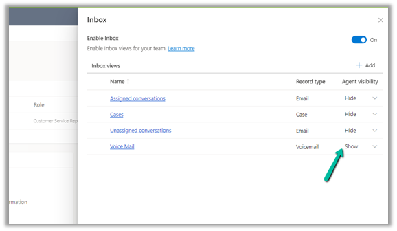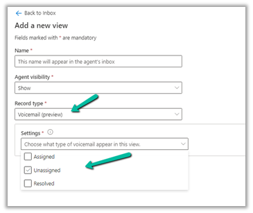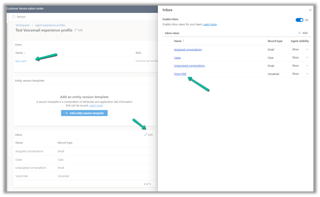 Agent Experience Profile for the agent. Enable Inbox. Specify a view for Voicemail |