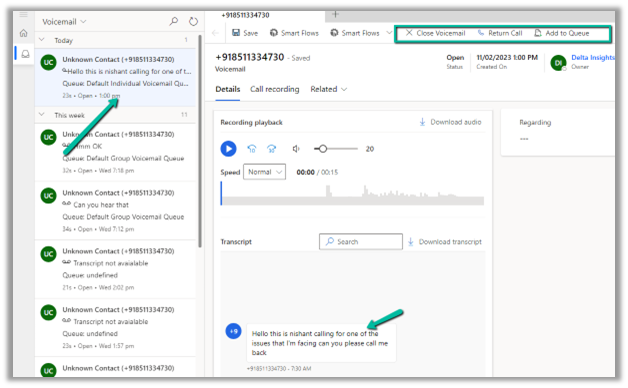 The user can hear the recording, call back the customer using Return Call, Add to Queue, or close the voice mail.