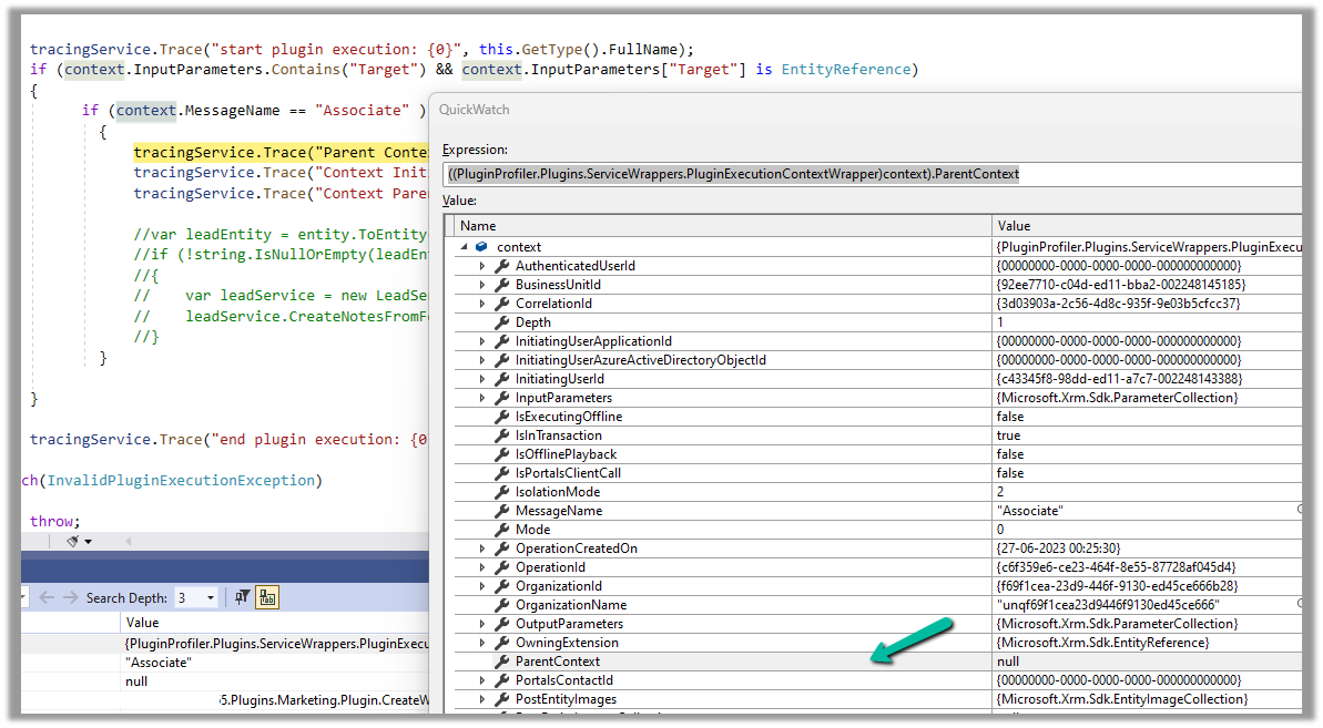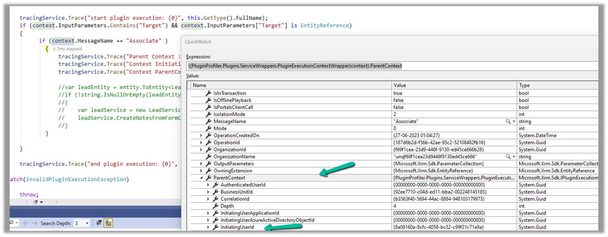 Below we can see ParentContext property getting populated and also in the InitiatingUserId property we get the id of the user who triggered the plugin.