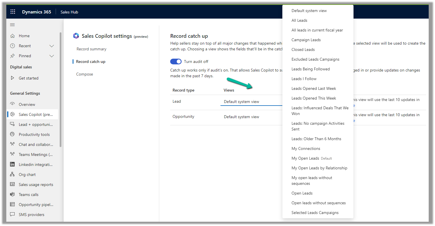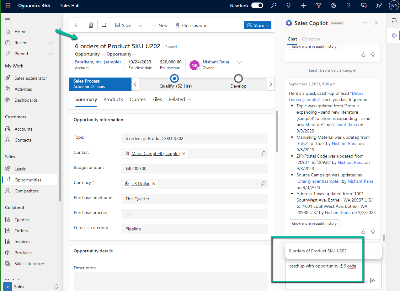 Using Sales Copilot, we catch up on updates to a lead and opportunity record since the last seven days or the last login.