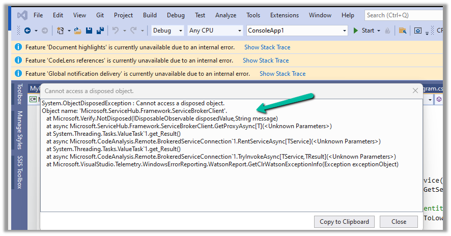 One thought on “Fixed – Feature ‘Semantic classification, Document Highlights, etc. ’ is currently unavailable due to internal error – Visual Studio”