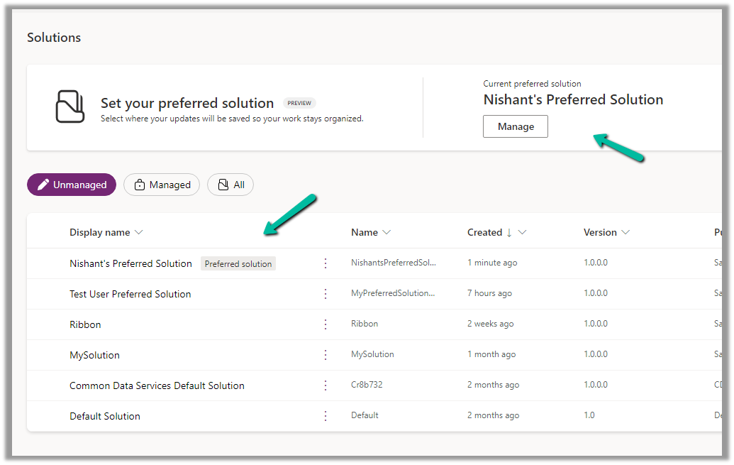 We can click on Manage to specify any of the existing unmanaged solutions as the preferred solution or to create a new solution.