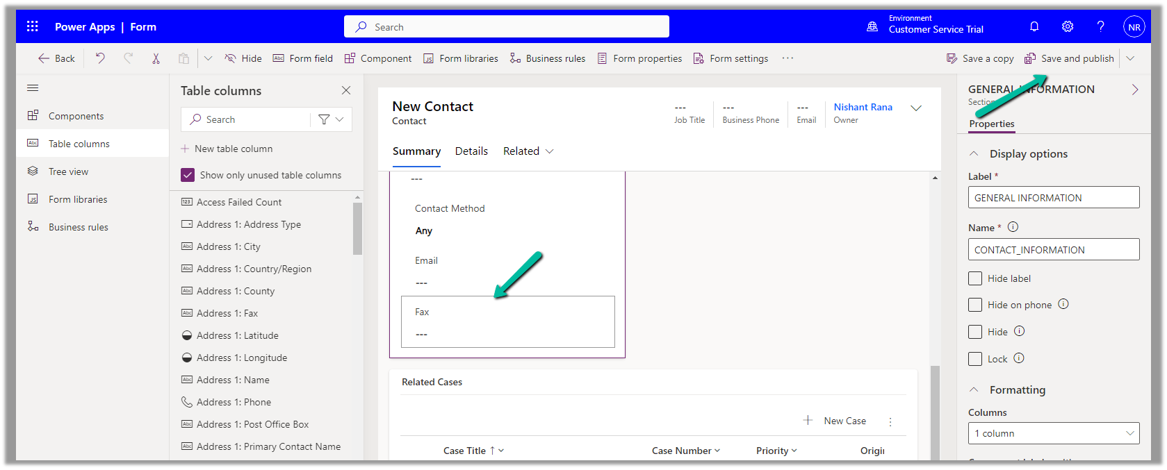 Now let us add an update existing table outside the context of the solution. Here we are updating its form by rearranging some of the fields in it.