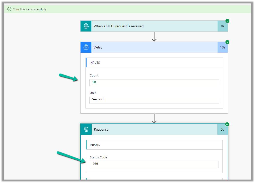 To test the timeout, we created a below Microsoft Flow with HTTP trigger, Delay and actions to be used as Webhook.