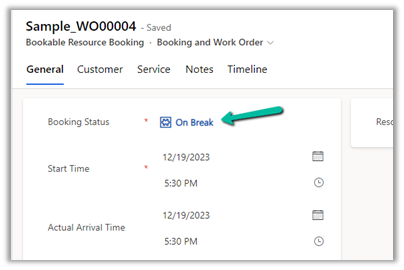 On changing it to On Break, we can see a new booking timestamp record created as that changes the Field Service Status.