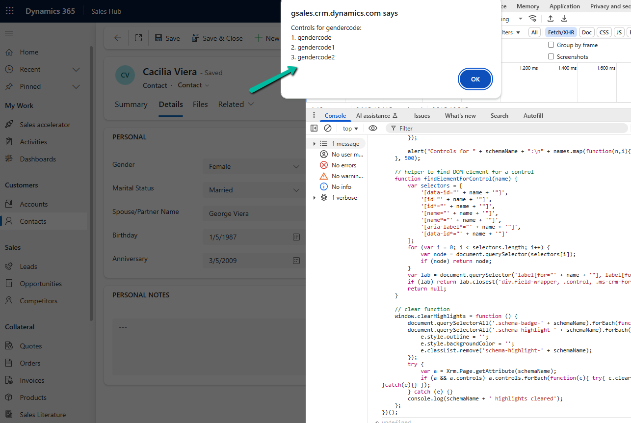 When we run this in the console, it: Highlights all instances of the field with an orange outline and light background. Adds a small badge like gendercode 1, gendercode 2 next to each control. Alerts and logs the schema names so we can directly use them in our scripts.