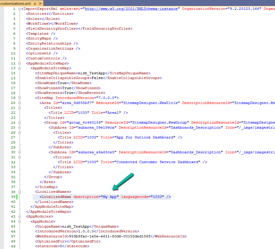 After exploring the UI options and confirming that the sitemap display name cannot be updated there, the only approach that worked was a solution-level change. The solution was to export the solution that contained the sitemap, update the sitemap display name in customizations.xml, and then import and publish the solution again. We exported the solution as unmanaged and extracted the ZIP file. Inside the extracted files, we opened customizations.xml. This file contains the full definition of the app’s sitemap, including its localized display name. Within the XML, the sitemap definition appears under the AppModuleSiteMaps section. A simplified version of the relevant structure looks like this: