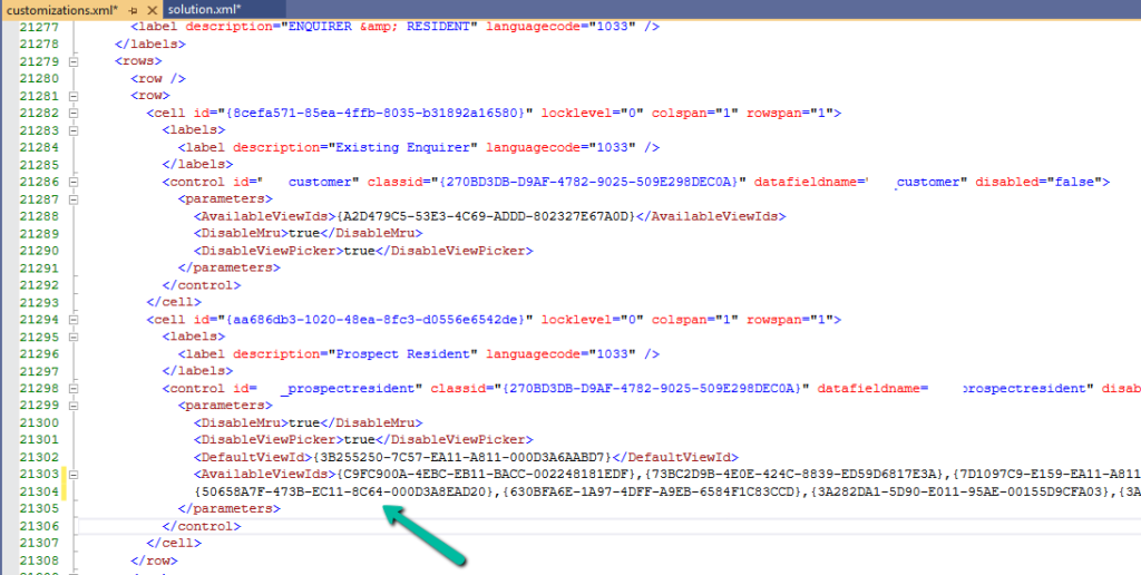 Using that view GUID ({50658a7f-473b-ec11-8c64-000d3a8ead20}), we searched inside the customizations.xml file. This revealed that the view was still being referenced by one of the lookup controls (display name “Prospect Resident”), even though the form configuration showed a different default view. Essentially, the form XML still contained an old reference to that view.