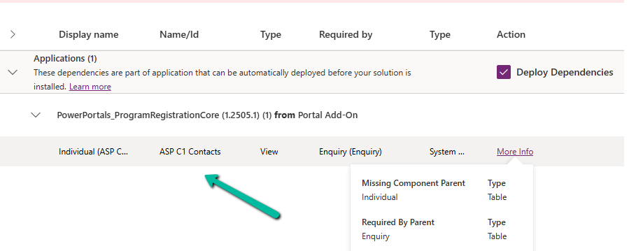 The error indicated that a specific Contact view (ASP C1 Contacts) was missing. When we checked the dependencies, it showed that this view had a dependency on the main form of a custom table.