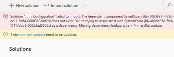 Solution ” Configuration” failed to import: The dependent component SavedQuery (Id=50658a7f-473b-ec11-8c64-000d3a8ead20) does not exist. Failure trying to associate it with SystemForm (Id=a00da85e-5fc4-f011-bbd3-000d3ad2506c) as a dependency. Missing dependency lookup type = PrimaryKeyLookup.