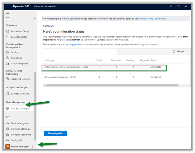 Now let us open the Customer Service Hub, and navigate to Service Management Area – ARC and SLA Migration tool