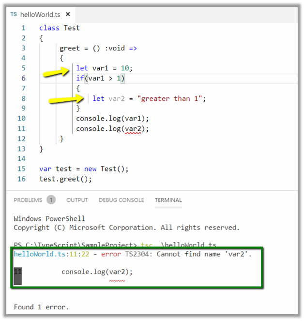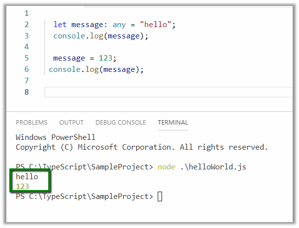 To compile the TypeScript code, open the integrated Terminal in Visual Studio Code and type