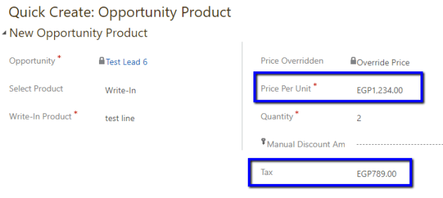 We created the Opportunity Product using Quick Create form. Here, we were able to put Price Per Unit and Tax using currency Egyptian Pound.