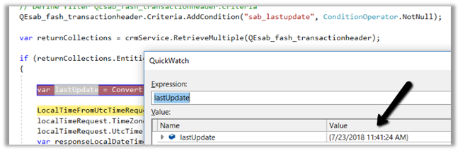 Within VSTA project, inside main.cs we defined a date time variable to hold value coming from the CRM Source Component i.e. the value of last update field.
