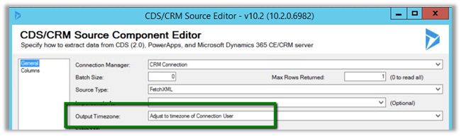 Now as we wanted to set the variable value from one of the records in Dynamics 365 CE, we used KingswaySoft’s CDS/CRM Source Component Editor, that will return us one row using fetch xml + max rows returned property.
