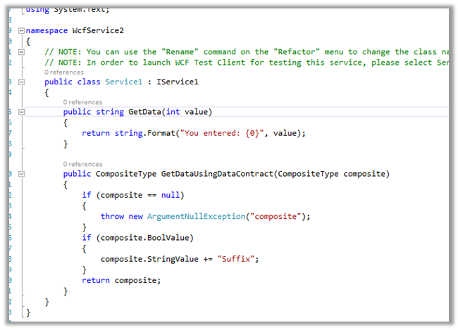 We will take an example of the OOB WCF Service that gets created when we create a new WCF Service Application.