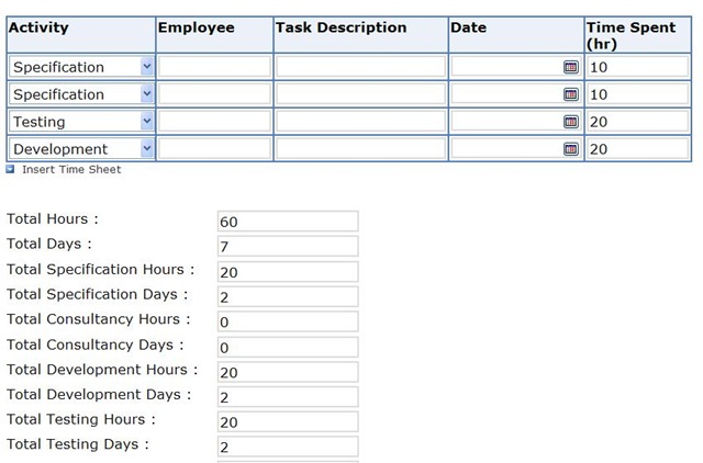 So above here, based on activity selected and time spent specified for it, the Total hours and Total days ( total hours/ 8) needs to be calculated.