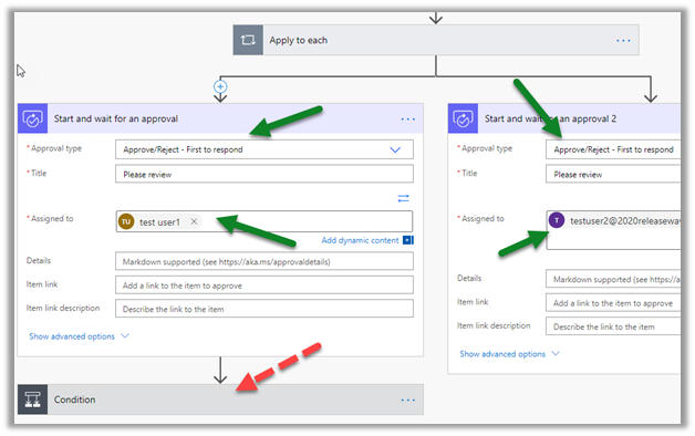 Remove Get manager (V2) 2 action from If Yes step, as we already have the email address of the manager now and specify the same in the Start and wait for an approval action’s Assigned to field.