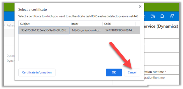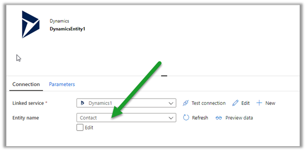 Select the Dynamics data set and specify the linked service.