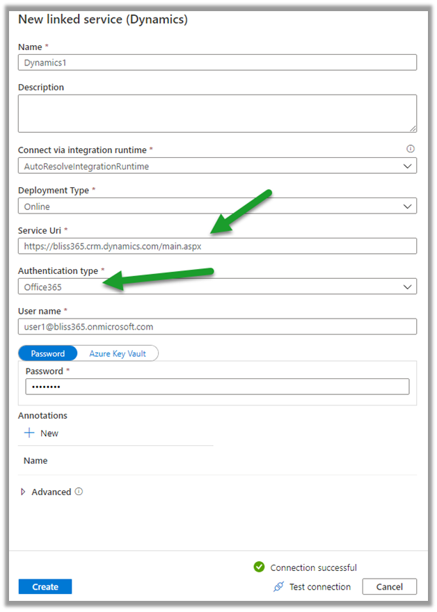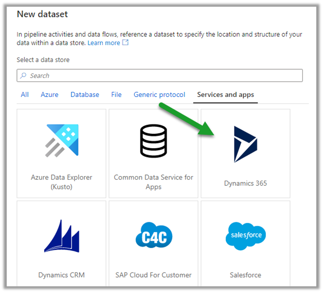 Similarly, let us define a new dataset for Sink which will connect to our Dynamics 365 Instance.