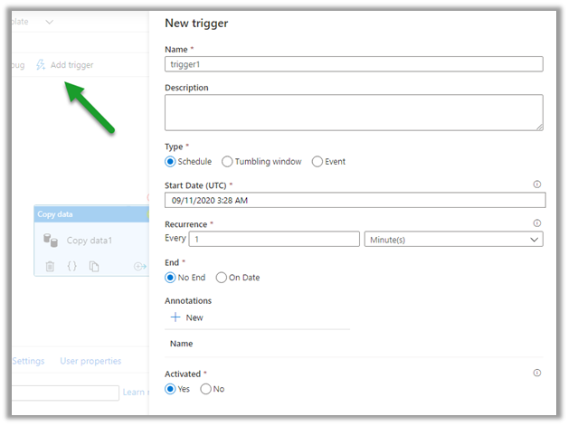 And drag the Copy data activity to it