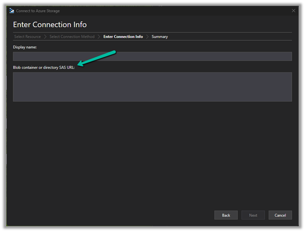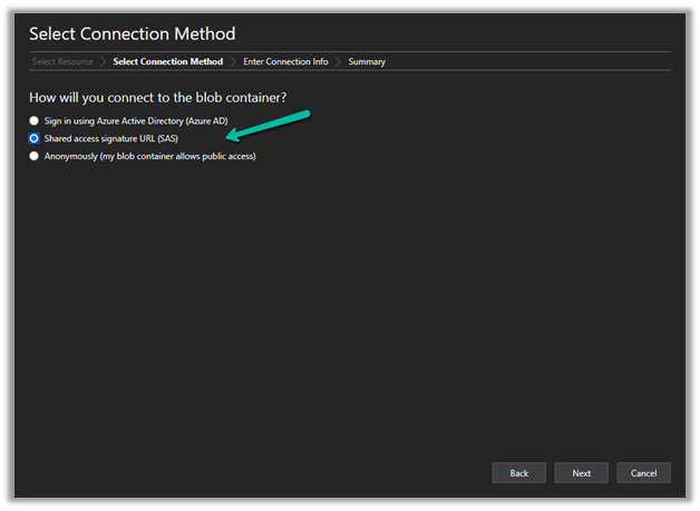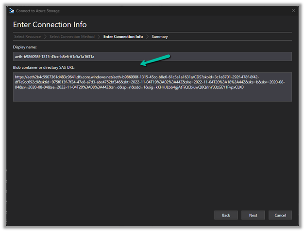 Construct the SAS URL which we will use in the Azure Explorer’s connection info <a href="https:///CDS?https://<ContainerURL>/CDS?<SASToken>