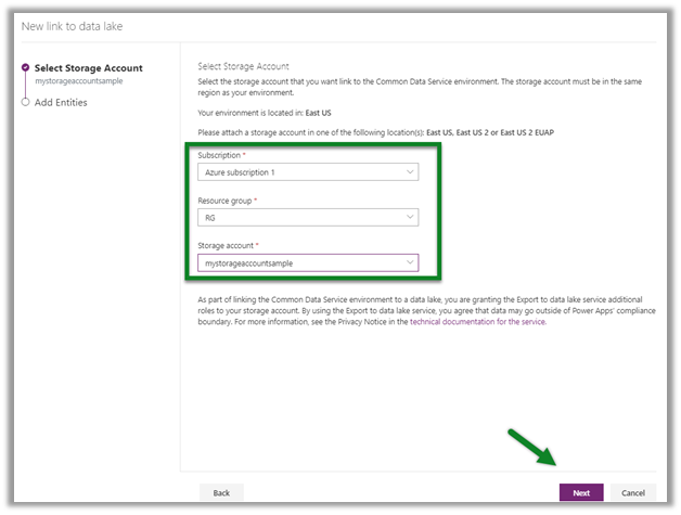 With the storage account created successfully, navigate to PowerApps select the option Export to data lake.