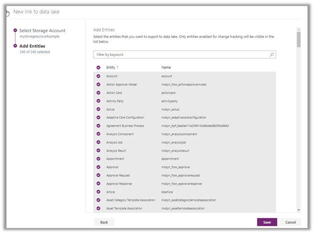 Select the entities to be exported to the data lake. Enable change tracking for the entities, as only these entities will be exported.