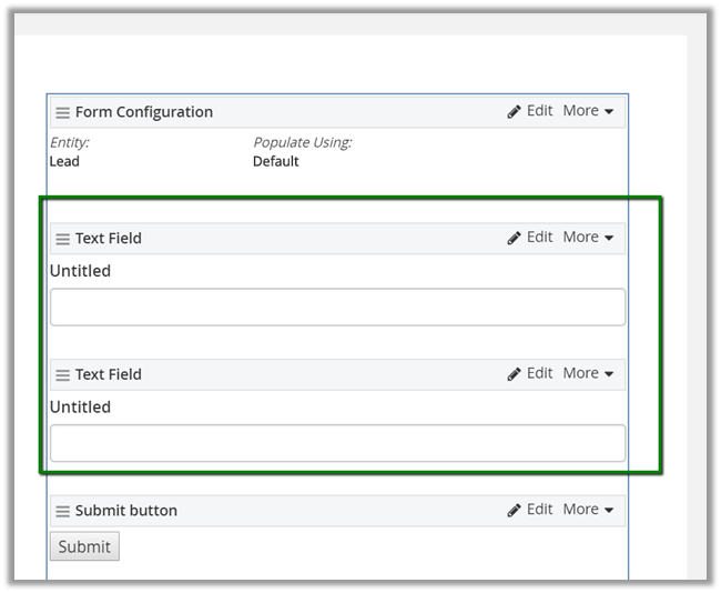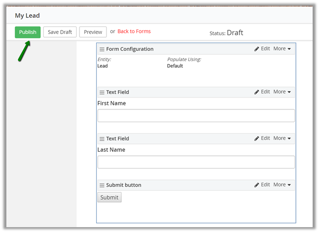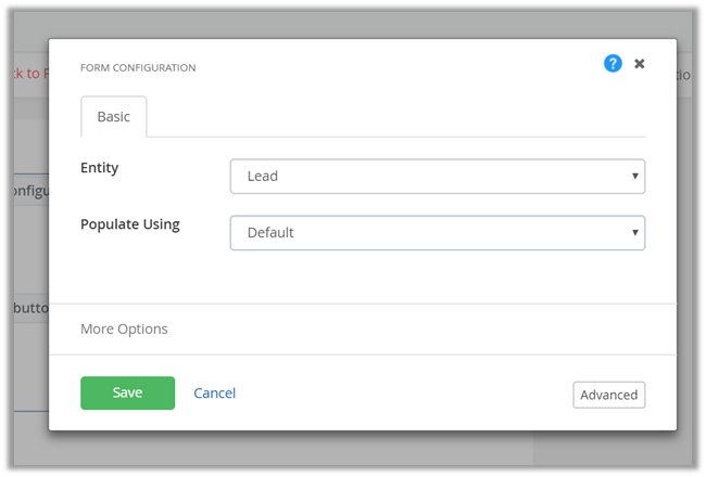 Click on Edit inside Form Configuration and specify the Lead entity we just created.