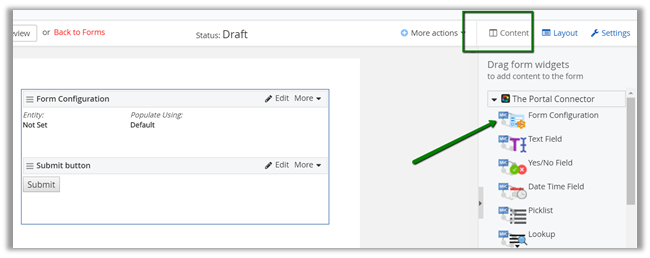 Then go to Content tab, and add Form Configuration