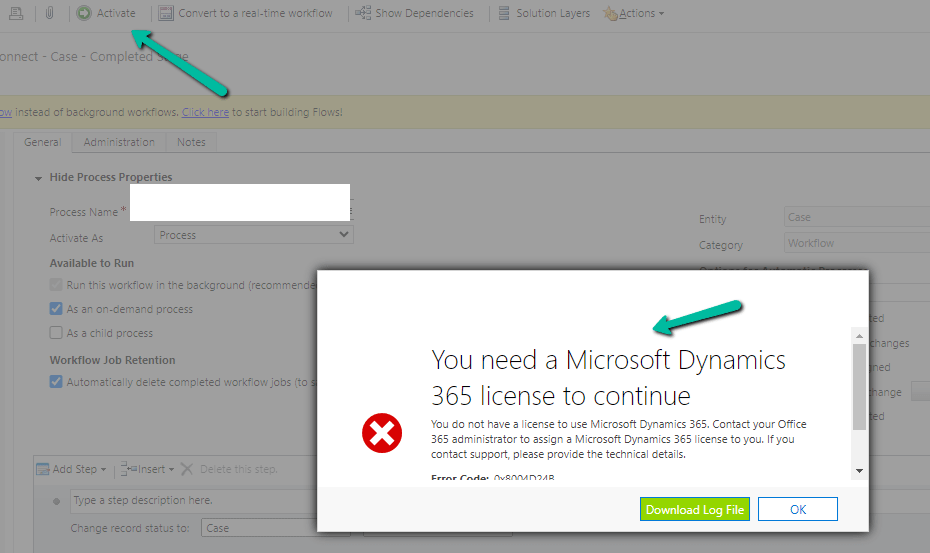 Turn on failed. The user with SystemUserId=xxxxxxxx-483e-eb11-bf70-000d3a795b83 in OrganizationContext=xxxxxxxx-a88f-4f40-b654-7bab4d5c1f95 is not licensed. Please contact your system administrator to add license to this user for the action to succeed. SystemUserAccessMode=0 is not either of (NonInteractive=4, SetupUser=1). User IsDisabled=True, IsLicensed=False. ImpersonatingSystemUserId=xxxxxxxx-9fe2-47b8-84a9-d87c65dc9dfd.