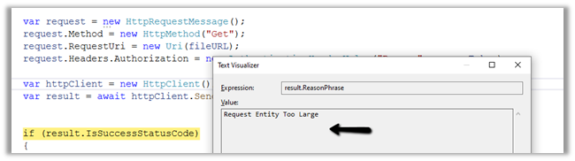 Below is the sample C# code to download the file if the size is less than 16 MB