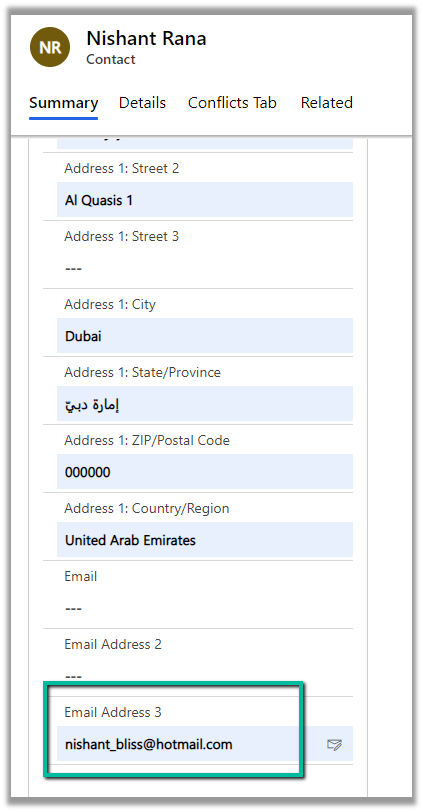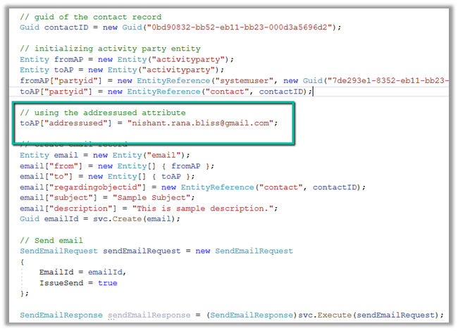 This time our code will run without error, and CRM will pick up the email id specified in the email address 3 field. It will first check for email, then email address 2, and then finally email address 3 field. This happens only in the case of out of the box entity like contact and account.
