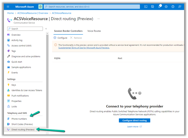 Once the ACS resource is created, we have the option to configure the Phone Numbers (if we are using the numbers provided by Microsoft) or Direct Routing (for other carriers) as specified earlier.