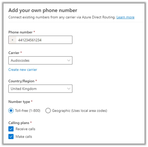 For Direct Routing, select Add number for Bring your own number via Azure Direct Routing (preview)