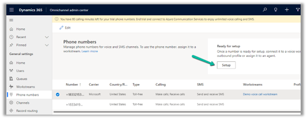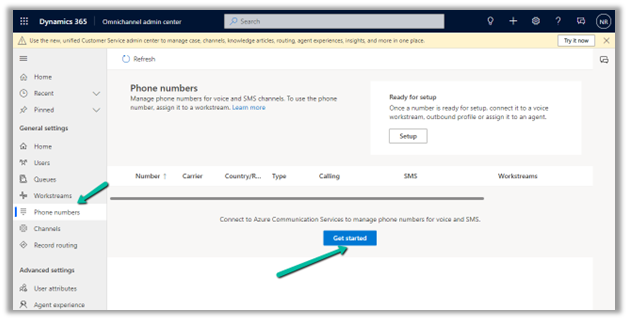 To configure the Omnichannel’s voice configuration using the ACS, navigate to Phone Numbers in the Omnichannel admin center and click on Get started.