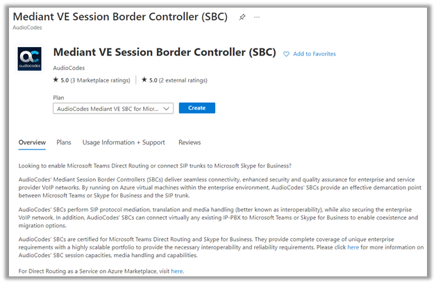 For Direct Routing to work, we could configure products from the certified SBC Vendors, one such example is AudioCodes – Mediant VE Session Border Controller (SBC) from Azure Marketplace.