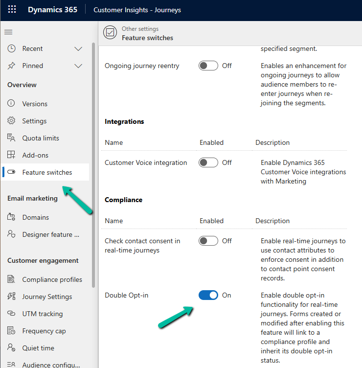 Go to Settings > Feature Switches > Compliance (Double Opt-In)