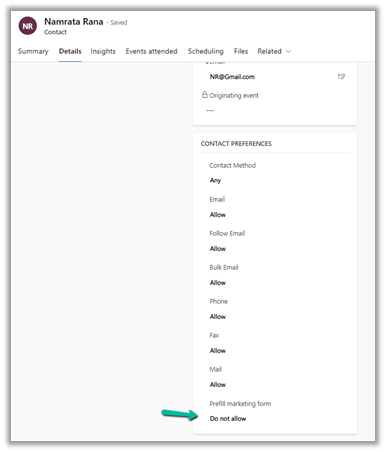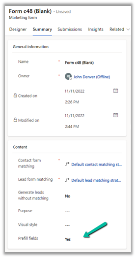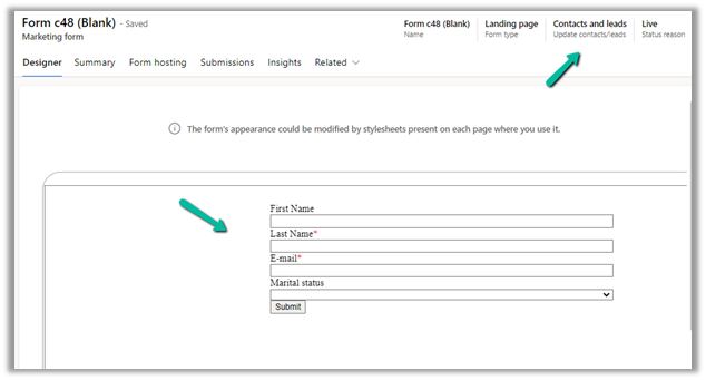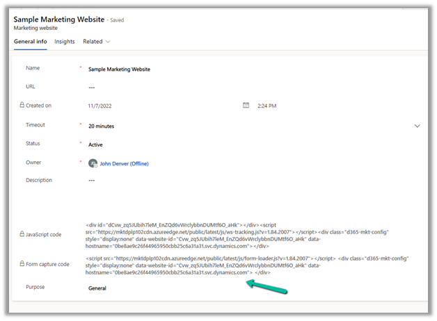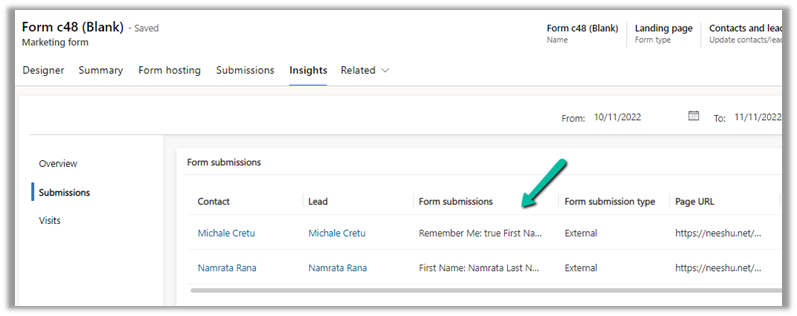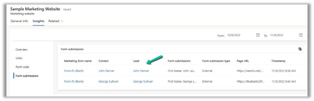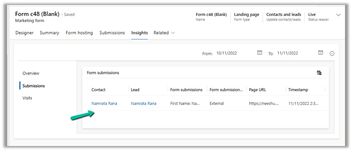 Open the Marketing Website record or the Form , we can see the details added to the Visits and Submissions section of Insights.