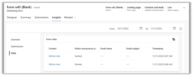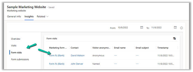 Let us again check the Insights tab in the marketing website record or the marketing form. We can see it being tracked in Visits, Form Visits as well as Form Submissions.
