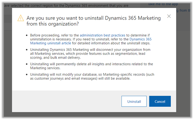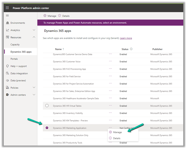 And within Power Platform Admin Center https://admin.powerplatform.microsoft.com/, we can navigate to Dynamics 365 Apps >> Dynamics 365 Marketing Application solution and select Manage.