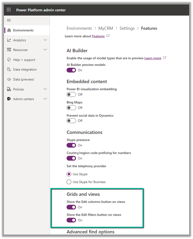 We can also show and hide the Edit Columns and Edit filters option on views from Power Platform Admin Center >> [Environment] >> Settings >> Features >> Grid and Views section