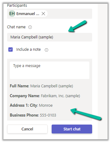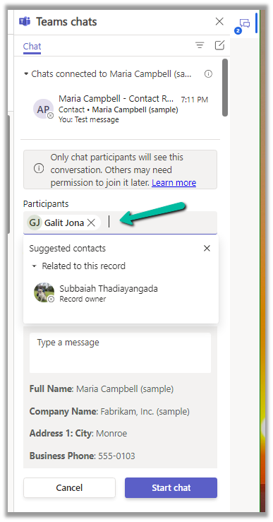 Similarly, we can also start a regular chat (not associated with any record) using the compose icon in the Teams Chat panel.