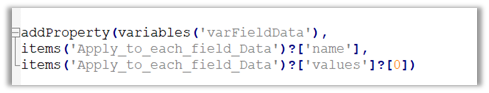 So in the next step, we loop through each field_data, than use addProperty function in Compose to add name and value to the varFieldData object, and use the outputs of compose to set the varFieldData variable.