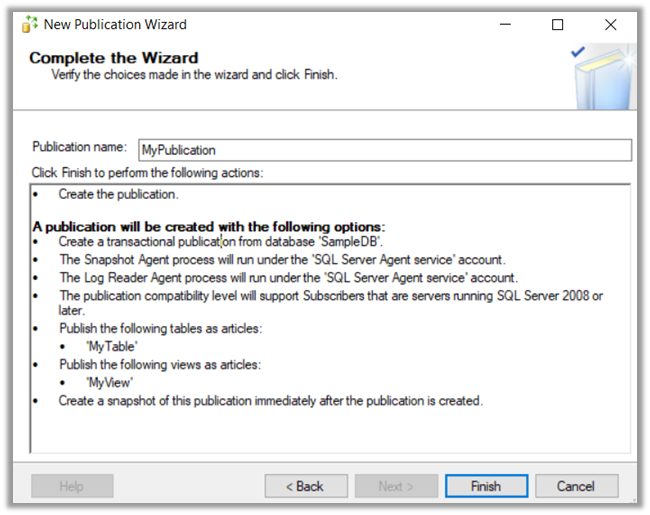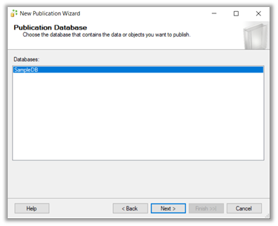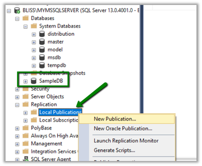 Right-click the publication and select new publication. SampleDB is the DB from whose table and view we want to publish.