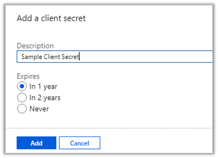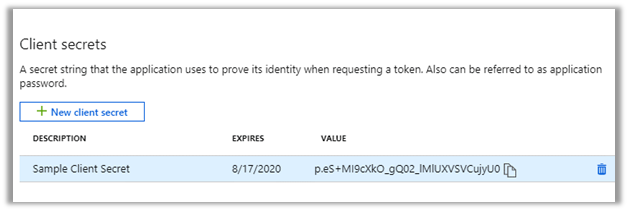 Click on New client secret button to generate the client secret. Copy the generated client secret. Select the expiry as per the need.