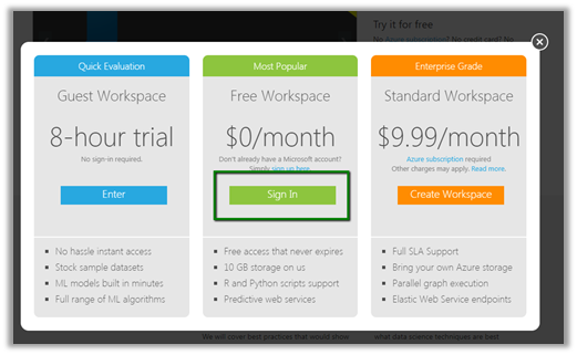 To try it free, go to Machine Learning Studio’s home page and sign in with the existing Microsoft Account. (or we can make use of existing Azure Account and add Machine Learning to it)