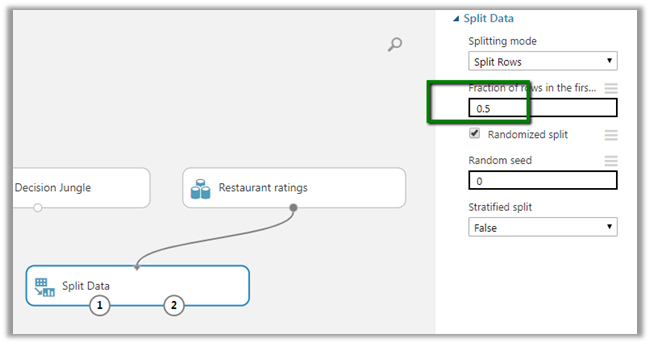 Here we have specified our dataset as input to the Split Data module and specified fraction of rows as 0.5 which means that 50 percent of the data will be used for training and the remaining 50 percent will be our test data.