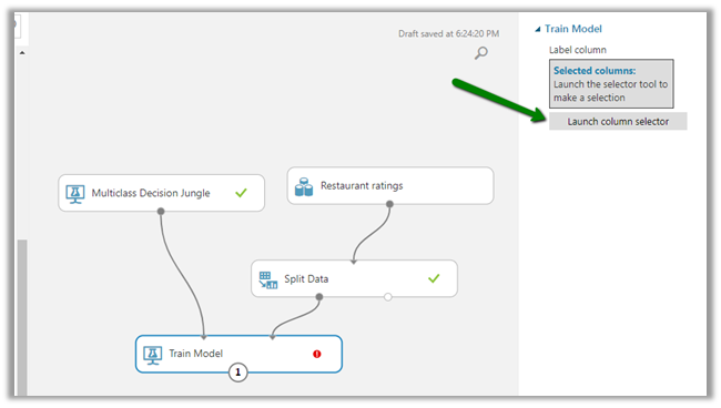 Now to train the model, drag the Train Model module. Specify the algorithm and the split data as the input to that module and click on Launch column selector.