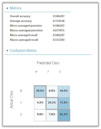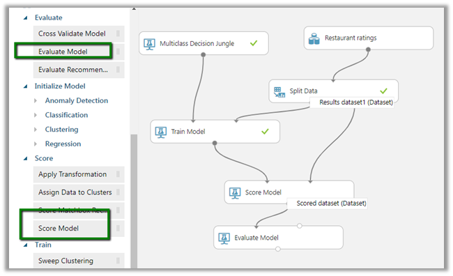 Next, we’d add the Score Model module and Evaluate Model module to see the how the algorithm is performing.